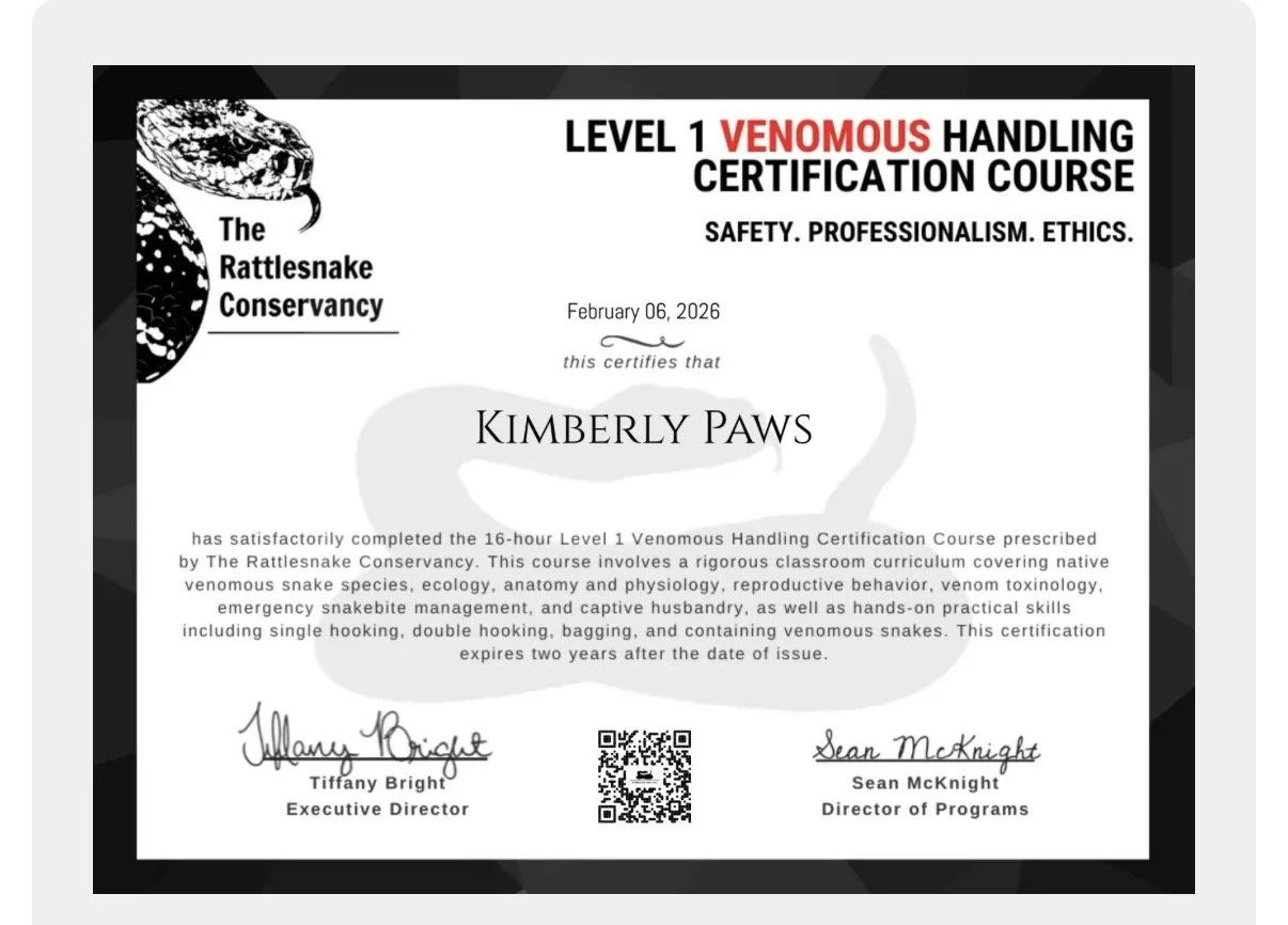 My work combines humane rattlesnake removal, canine avoidance training, and community education, with the goal of keeping families, pets, and wildlife safe. I am continually learning and expanding my skills so I can provide the most effective, science-based, and compassionate services possible.